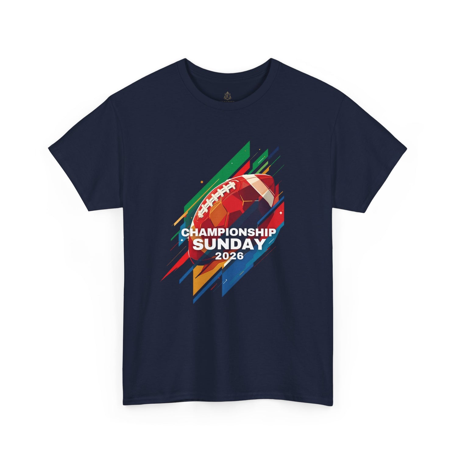 A bold, colorful football graphic slices across the chest with dynamic stripes and the text “Championship Sunday 2026,” capturing the rush of kickoff and the roar of the crowd. Lightweight but durable cotton keeps it breathable during tailgates and rallies.